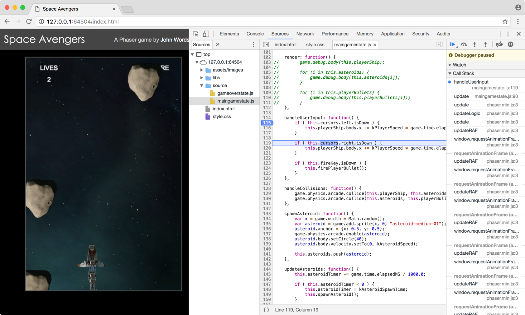 From the list of files down the side, you should be able to locate the JavaScript files that make up your game. From here, you can open any of these script files and see the code you’ve written in Brackets. From here, you can click on the line number on the grey bar to the left of your source code and a blue arrow should appear next to that line of code. That’s all it takes to set a break point! The next time your application reaches this line of code - everything will completely stop and you’ll be able to see the value of variables in your code and step through your code one line at a time.