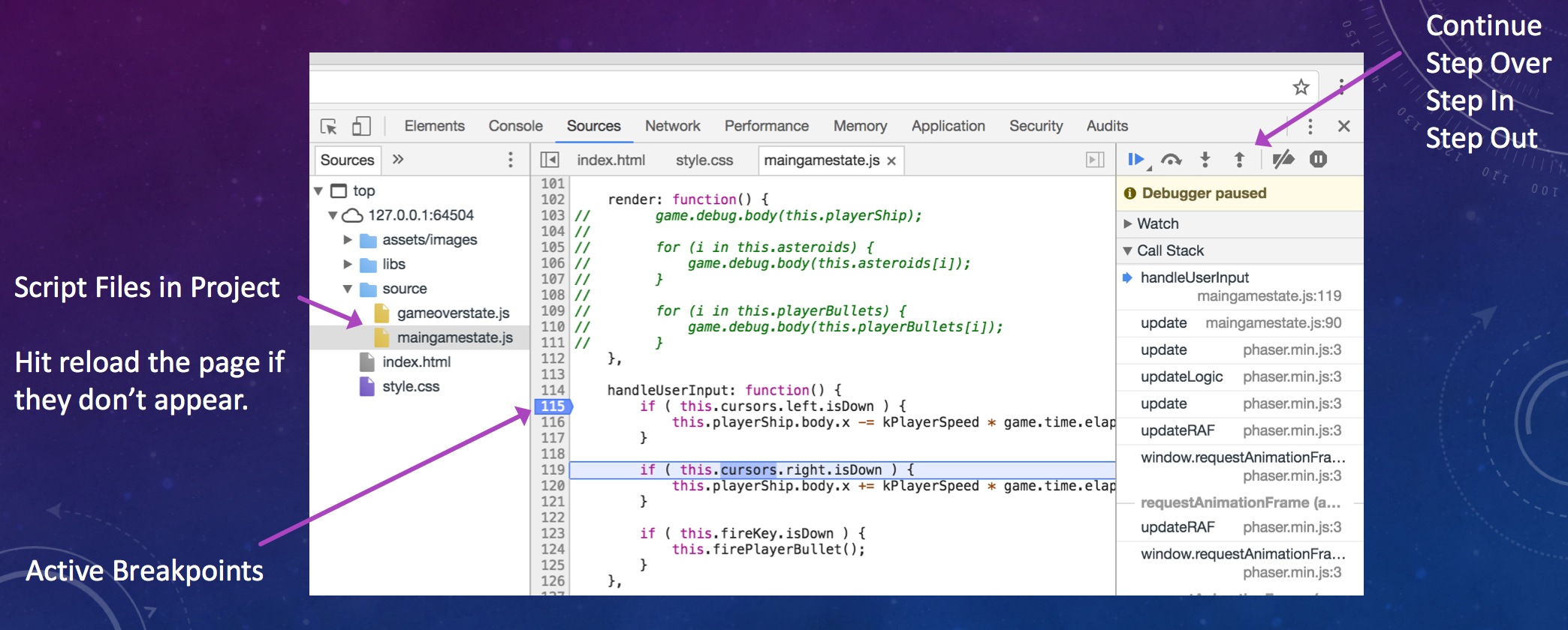 Note. If your game is already running, you might need to refresh the page in order to hit your new breakpoint. For instance, if you have set a breakpoint in the setup code for your game - your application likely only runs this code once when your game starts and then it never runs it again.