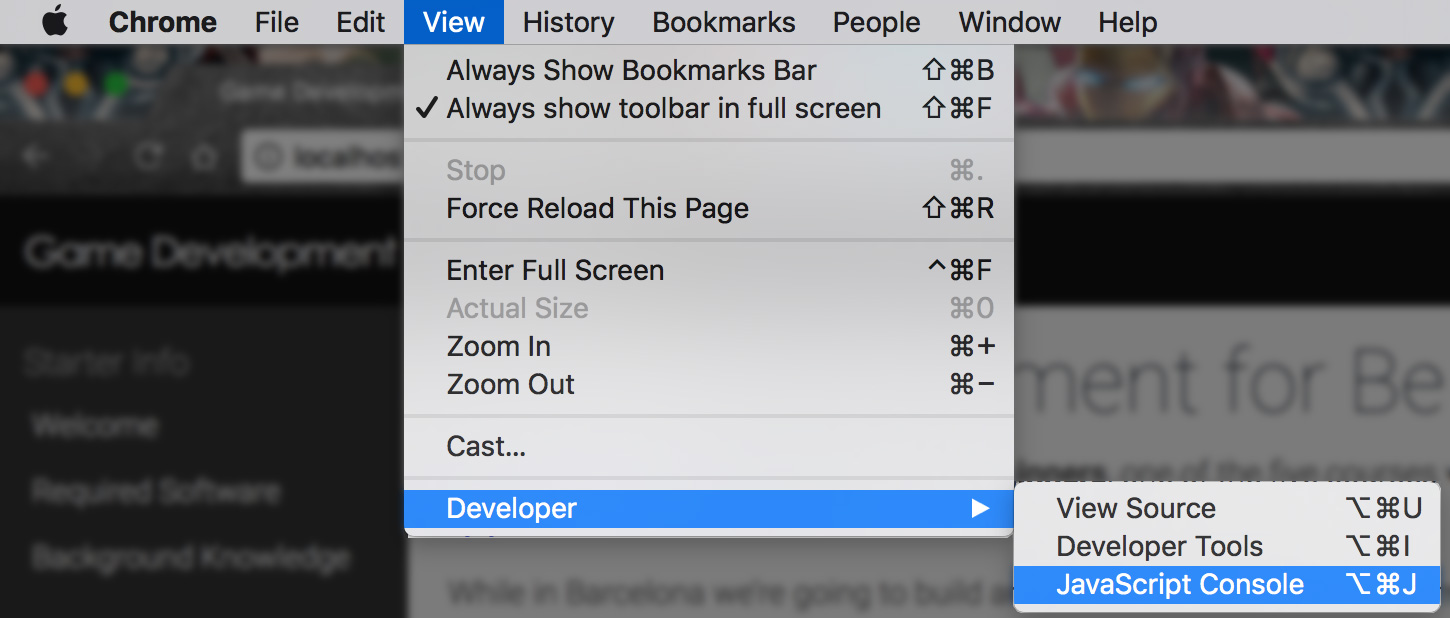The JavaScript Console is a convenient place to read all of the console.log(); messages that are printing out from your application. console.log(); is a convenient way to print out debug information while your game is running. If you’re having problems figuring out why something isn’t appearing on screen for instance, you might print out it’s position to make sure it’s not outside of the camera.