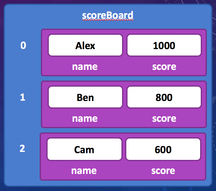Consider the example of a score board in a video game. For a high score table, we want to associate a name and a score with each position on the score board. For this example, we might want our data to look something like this;