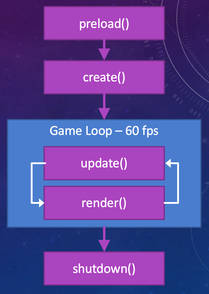 preload(): This is called once when Phaser knows you will show this scene soon. It is used to load up all of the images and audio you need for the game.